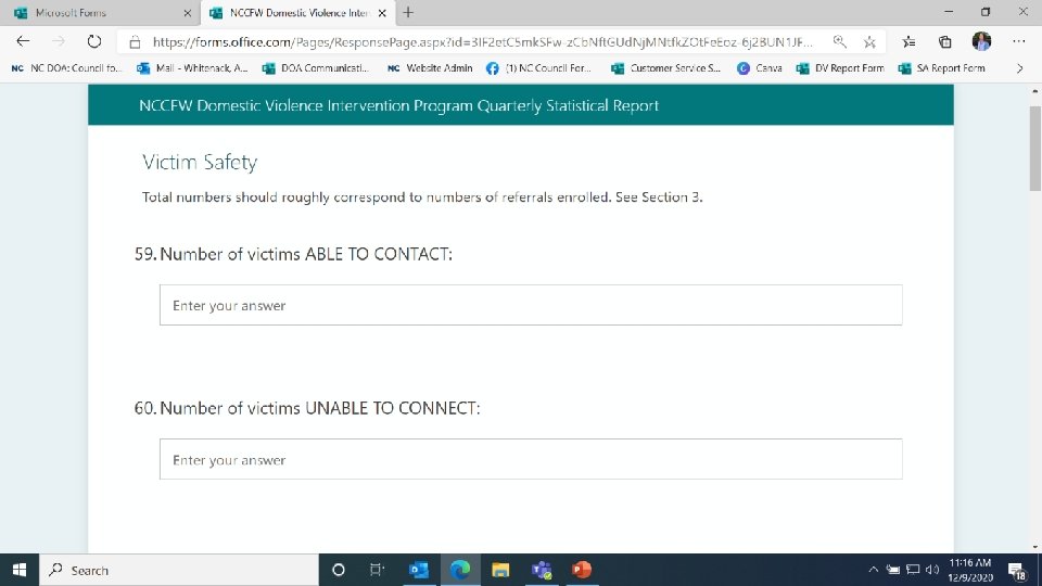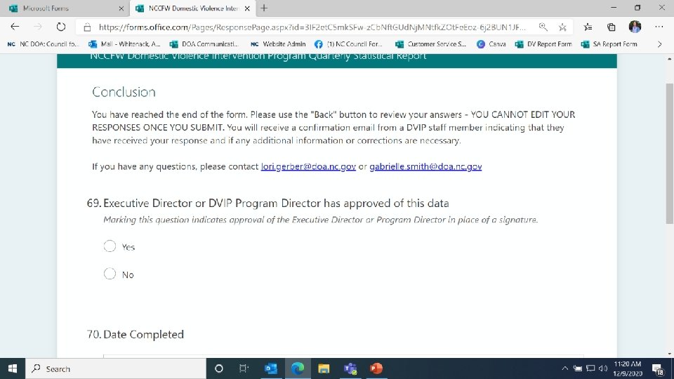 If you have questions about the report itself, you can contact Allison. Whitenack@doa. nc. gov. This is the beginning of the report. You will notice that you MUST complete the form in one sitting. Therefore, access the link for a preparation tool to prep your responses before filling out this form.