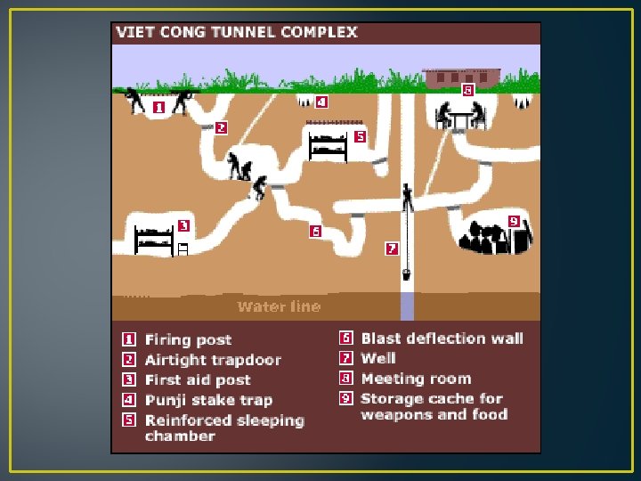 Ho Chi Minh trails • Network of roads built from North Vietnam to South Vietnam through the neighboring countries of Laos and Cambodia • carried more than 1 million N. Vietnamese soldiers and supplies to battlefields in S. Vietnam • Not only a trail but connected to underground tunnels • Radio and telecommunications facilities, food and weapons caches, medical aid stations and barracks, all underground, hid thousands of the North Vietnamese during the war.