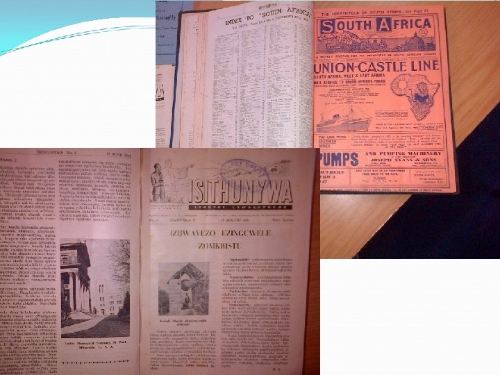 Resources and services avail. ACADEMIC BOOKS REFERENCE MATERIAL HISTORIC – AFRICANA MATERIAL SA HISTORY and legal publications INDEGENOUS Languages MATERIAL ON LINE DATABASES NEWSPAPER ROOM INTERNET ROOMS AND WIRELESS CONNECTION MAGAZINE AREA