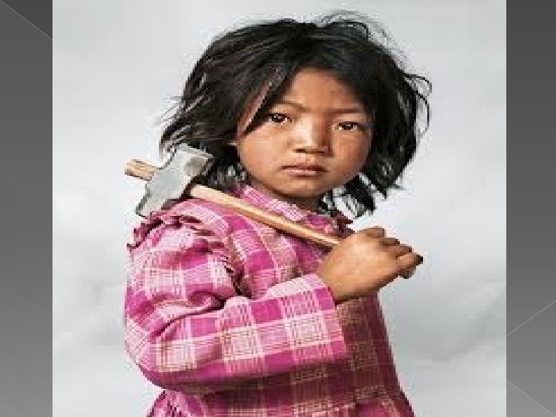 Indira � Vive con sus padres, hermano y hermana cerca de Katmandú, en Nepal. Su casa tiene una habitación, con una cama y un colchón en el suelo, que los niños comparten. Indira tiene 7 años y desde hace cuatro trabaja en la cantera de granito, cinco o seis horas al día. Luego ayuda a su madre con las tareas del hogar y va a la escuela, queda a 30 minutos caminando. No le importa trabajar pero preferiría jugar. Su comida favorita es fideos y cuando sea grande quiere ser bailarina.