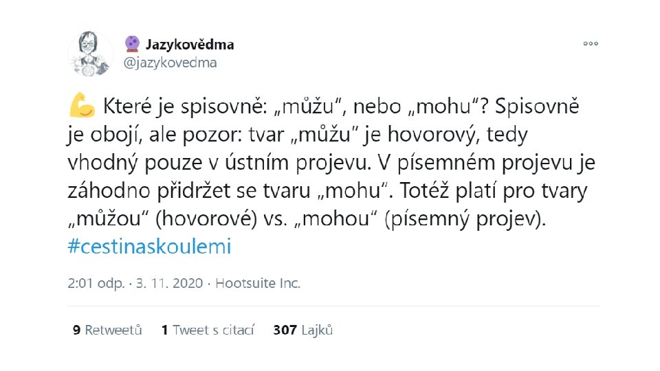 Co je to HOVOROVOST? Pokud HOVOROVOST = ústní projev, pak psaný projev = ? ? ? • mohu × můžu, moct × moci, říct × říci • děkuji × děkuju, píši × píšu, píší × píšou, potřebují × potřebujou • koukat × dívat se