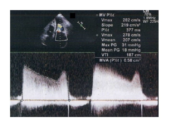 Post balloon mitral valvuloplasty • Accuracy of calculated MVA by PHT declines immediate post BMV. • PHT is directly related to chamber compliance and peak transmitral gradient • Following BMV, abrupt changes in left atrial pressure and compliance occur altering the relationship between PHT and Mitral valve area. • This effect on PHT lasts 24 to 48 hours.