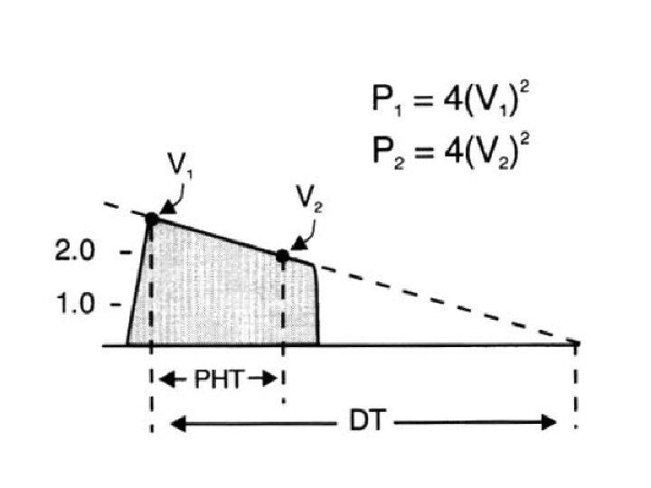 Pressure half-time and deceleration time The pressure half-time (PHT) is defined as the time (in milliseconds) required for the peak initial pressure to drop by one half. Doppler signal measures velocity The modified Bernoulli equation is applied to convert velocity to pressure. PHT is the time (in milliseconds) for the velocity to drop to 0. 707 of the maximum velocity. V 2 = (0. 707) x V 1