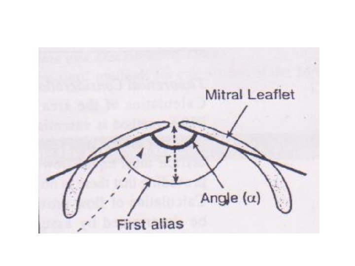 Angle correction PISA principle is for flow approaching narrow planar surface In Mitral Stenosis, mitral leaflets may be funnel shaped To account for altered shape, angle corection factor ά /180 is applied. MVA= ( ά /180 ) x (2 Л r 2 x VN)/VMS