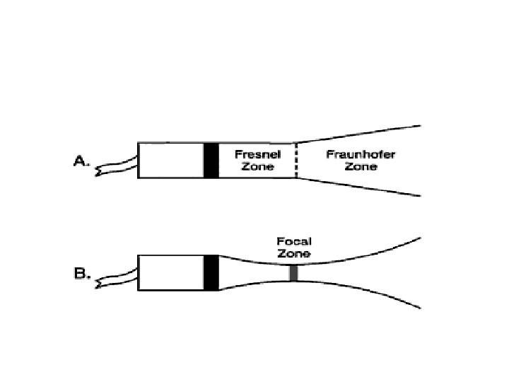 • Important feature of ultrasound is ability to direct or focus the beam as it leaves the transducer • Proximal cylindrical and distally divergent • Proximal zone –Fresnel zone • Divergent field is called Fraunhofer zone • Imaging is optimal in near field • Decreasing wavelength or increasing transducer size increase near field