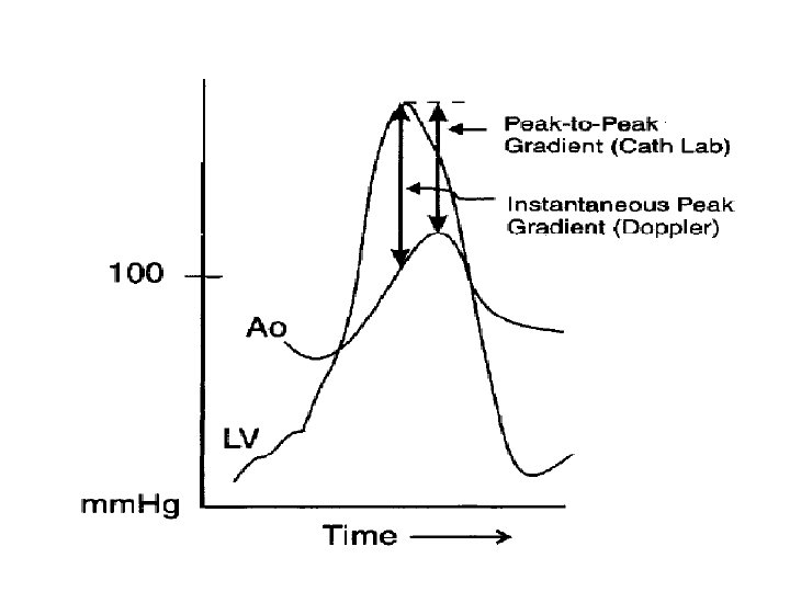 Discrepancies between Catheter derived and Doppler derived Pressure Gradients • Pressure gradients derived at cardiac cathetrisation and measured by Doppler may differ. • Catheter derived gradient is peak to peak gradient between LV and Aorta • Non simultaneous measurement • Doppler gives peak instantaneous gradient and is greater than peak to peak gradient.