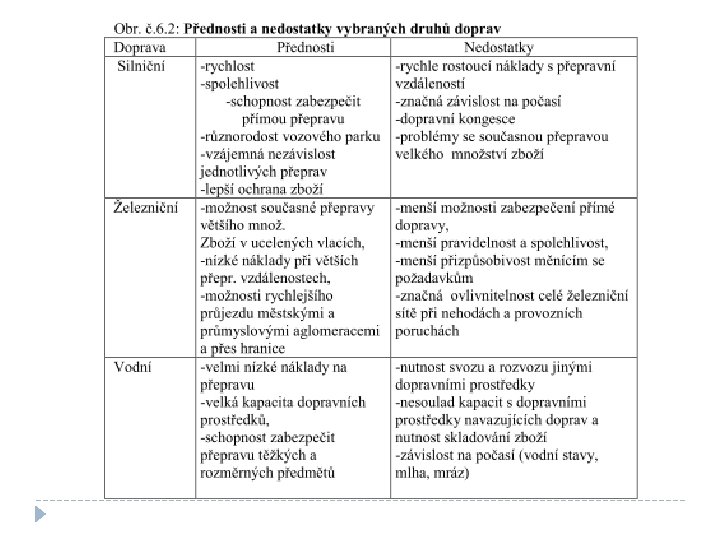 Základní vlastnosti vybraných druhů dopravy