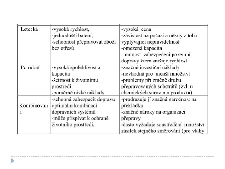 Ostatní druhy dopravy Letecká doprava je schopna zabezpečit rychlou dopravu na střední a Její nevýhodou je vysoká cena. Je vhodná proto pro přepravu malých, lehkých, ale cenných zásilek, které jsou mimořádně náročné na dobu dodání. dlouhé vzdálenosti. Kombinovaná přeprava se pro přepravu snaží využívat předností jednotlivých druhů dopravy a na tomto základě optimálně kombinovat jejich nasazení na realizaci požadovaného přemístění zboží. V systémech kombinované přepravy bývají spojeny přednosti silniční dopravy pro svoz a rozvoz zásilek (značná operativnost, rychlost a přizpůsobivost výběru použitých vozidel přepravované hmotnosti zboží) s výhodami železniční , nebo vodní dopravy ( vysoká kapacita a nízká cena při přepravě soustředěného velkého množství zásilek na velké vzdálenosti. )