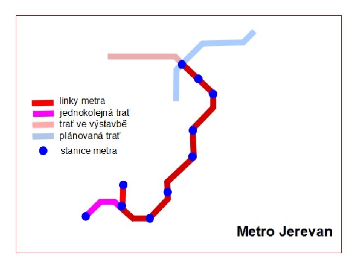 Metro Jerevan • zpočátku existovaly plány na výstavbu tramvajové rychlodráhy (částečně podzemní) • v roce 1981 byla otevřena linka metra a rozšiřovala se směrem na jih • celková délka tratí je zatím 12, 1 km – využívá se 10 stanic • metro se rozšiřuje k severozápadu – vzhledem ke složité finanční situaci nejsou známé žádné termíny dokončení