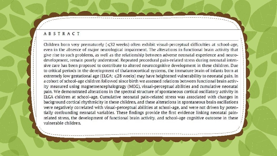 Dor neonatal relacionada ao estresse, atividade cortical funcional e habilidades visual-perceptivas em crianças em idade escolar nascidas em extrema baixa idade gestacional Neonatal pain-related stress, functional cortical activity and visual-perceptual abilities in school-age children born at extremely low gestational age. Doesburg SM et al. PAIN xxx (2013) xxx–xxx (publicação online) http: //dx. doi. org/10. 1016/j. pain. 2013. 04. 009 Apresentação: Barbara Lalinka de Bilbao Basilio Medica Residente de Medicina Intensiva Pediátrica – HRAS/HMIB/SES/DF Coordenação: Evelyn Mirela/Paulo R. Margotto Brasília 7 de agosto de 2013 www. paulomargotto. com. br