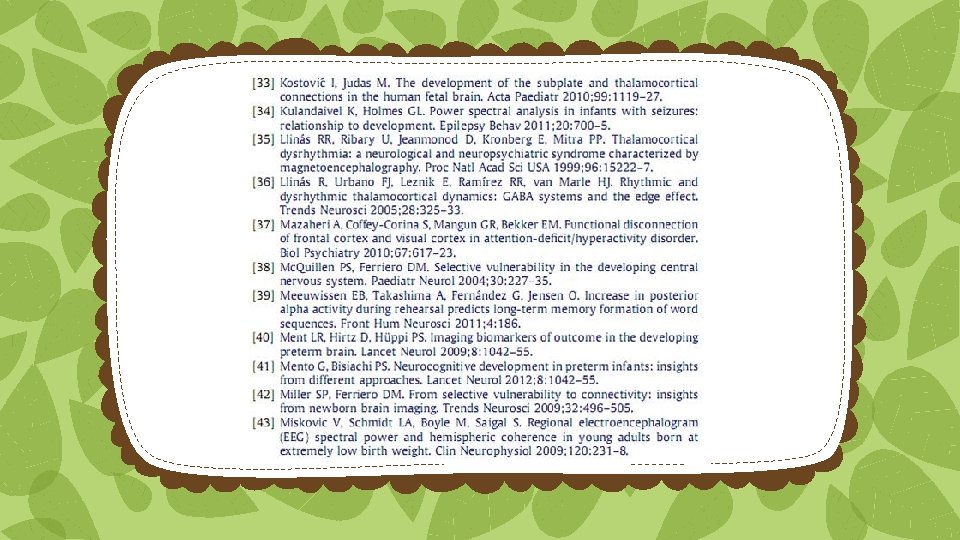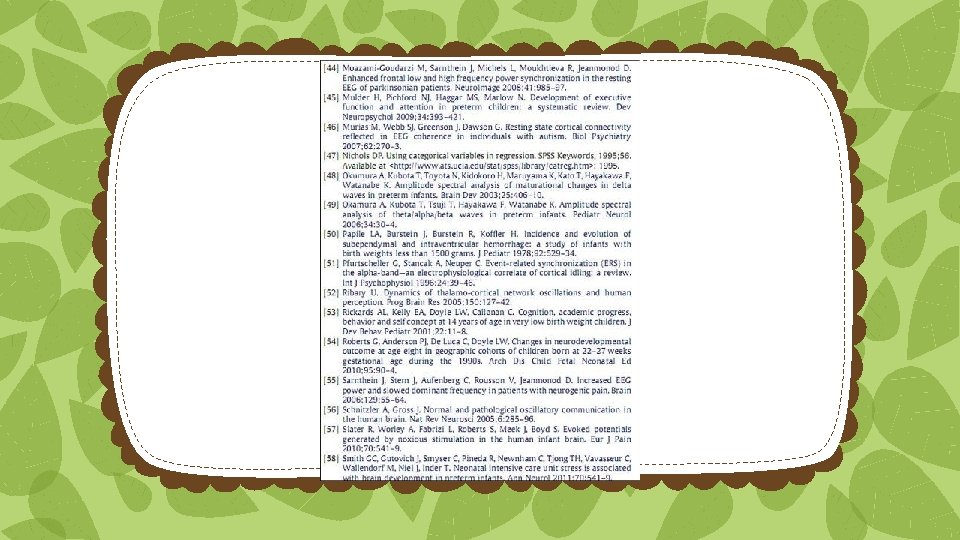 Discussão • A importância deste período de desenvolvimento do processo de maturação da atividade cerebral oscilatória é evidenciada pelas mudanças progressivas na composição espectral do EEG durante o período de pré-termo. • Investigações hemodinâmicos de conectividade funcional (fc. MRI) descobriram interações talamocorticais alteradas em prematuros. • Recentes resultados de MRI dos pesquisadores deste estudo em um grupo diferente de prematuros extremos também sugerem que a dor processual precoce , ao invés de dor durante o curso na UTI, pode estar associada com desenvolvimento cerebral alterado.