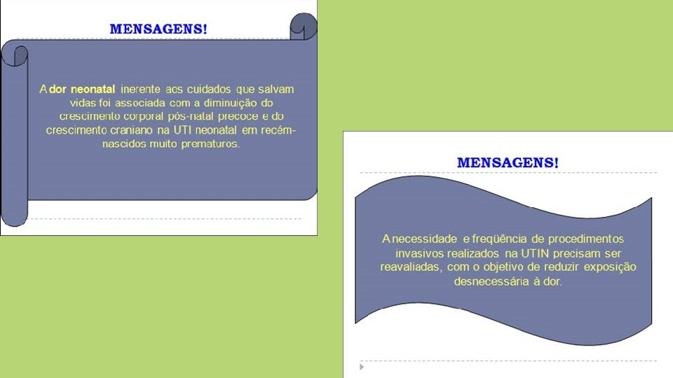 Discussão • Isto indica que estratégias farmacológicas atuais para controlar a dor neonatal pode não ser eficaz na redução da influência a longo prazo da dor processual em dificuldades seletivas do desenvolvimento prevalentes entre crianças muito prematuras. • O uso de regressão hierárquica como abordagem estatística teve a vantagem de se investigar a relação entre os procedimentos de perfurantes de pele, atividade MEG e resultado em idade escolar, independente dos efeitos de múltiplos fatores de confusão médicos associados à prematuridade • Usando essa abordagem, os autores demonstraram que os efeitos observados não foram influenciados por variáveis fundamentais, tais como a gravidade precoce da doença, ventilação, a cirurgia ou à exposição de morfina pós-natal. • Assim, os autores evidenciaram que a dor e o estresse estão associados com alteração estrutural e desenvolvimento funcional do cérebro durante o período neonatal e que a dor processual neonatal está relacionada ao desenvolvimento alterado de crianças muito prematuras nos primeiros 2 anos de vida