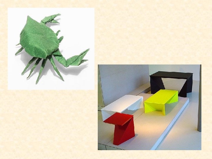 ORIGAMI Sztuka składania papieru, pochodząca z Chin, rozwinięta w Japonii i dlatego uważa się ją za tradycyjną sztukę japońską. W XX w. ostatecznie ustalono reguły origami: punktem wyjścia w ma być kwadratowa kartka papieru, której nie wolno ciąć, kleić i dodatkowo ozdabiać i z której poprzez zginanie tworzone są przestrzenne figury.