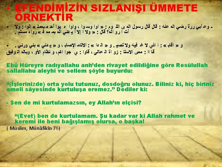 • HZ MUHAMMED SAV EFENDİMİZE ALLAH DOSDOĞRU OLMASINI EMREDİYOR { } ﺍ ﺍ : ﻗﺎﻝ ﺍﻟﻩ ﺗﻌﺎﻟﻰ «Emrolunduğun gibi dosdoğru ol. »