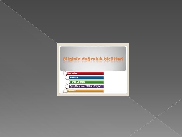 DOĞRULUK Mantık, matematik, yasa gibi doğruluk biçimleri bulunmaktadır. Mantık, yasa gibi sistemsel doğruluklar da kendi içinde tutarlı bir gerçekliği ifade eder.