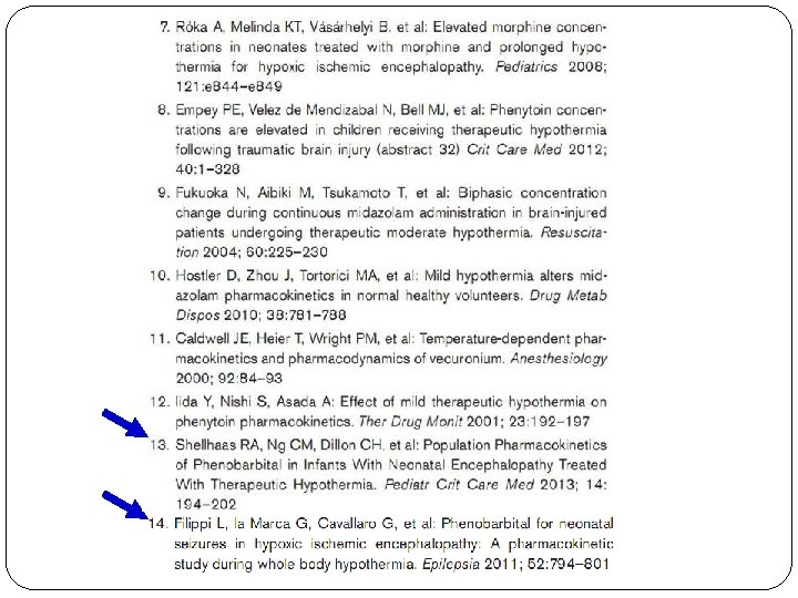 Shellhaas et al avaliaram as concentrações de fenobarbital numa coorte retrospectivo de 20 RN com síndrome hipóxico-isquêmica sob hipotermia e 19 sob normotermia. O objetivo deste estudo foi determinar se a hipotermia terapêutica explicasse uma parte significativa da variância na farmacocinética do fenobarbital. O fenobarbital é eliminado via várias rotas que incluem CYP 2 C, glucuronidação e vias diretas de excreção renal. Os autores observaram que o peso ao nascer e idade foram covariáveis significativas no clearance do fenobarbital, enquanto o grupo sob hipotermia não influenciou na farmacocinética do fenobarbital