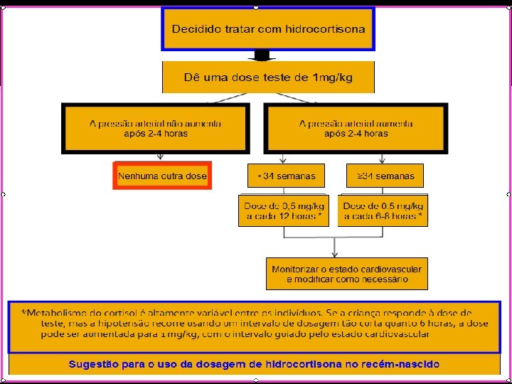 CONCLUSÃO Para hipotensão neonatal ou insuficiência cardiovascular, como em tantas situações clínicas, os profissionais devem tratar seus pacientes na presença de informações imperfeitas e limitadas. Tratar somente as crianças com sinais sistêmicos de insuficiência cardiovascular, tais como acidose metabólica, oligúria ou má perfusão e utilizando uma dose menor de hidrocortisona, deve ajudar a minimizar a exposição à hidrocortisona, enquanto também atinge o resultado terapêutico desejado. (consultem a Figura a seguir)