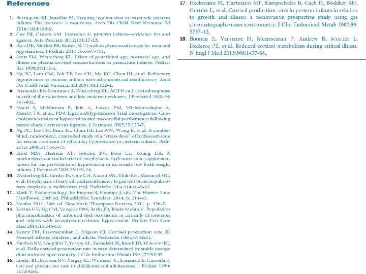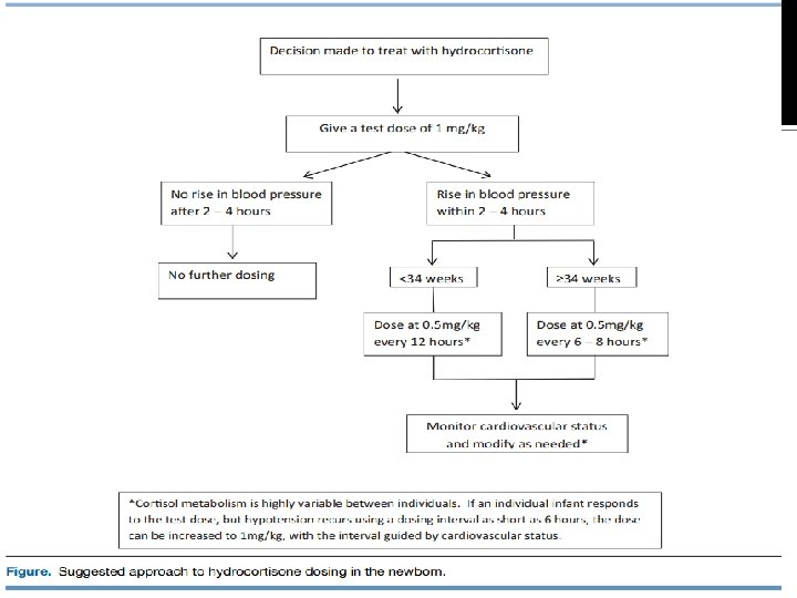 3) “Stress doses” = altas concentraçõesde cortisol Dose única de 5 mg/kg de RN a termo: Picos médios de 577 mcg/d. L de concentração sérica de cortisol (intervalo entre 507 -675 mcg/dl). (19) O tempo de meia-vida da hidrocortisona considerada neste estudo foi de 3. 5 horas; Concentrações séricas podem ter permanecido acima de 20 por quase 18 horas. Dados semelhantes em RN pré-termos extremos. Dose de 0. 4 – 0. 8 mg/kg/dose em RN com extremo baixo peso ao nascer: Concentrações acima de 20 mcg/d. L por 8 -12 horas. (20)
