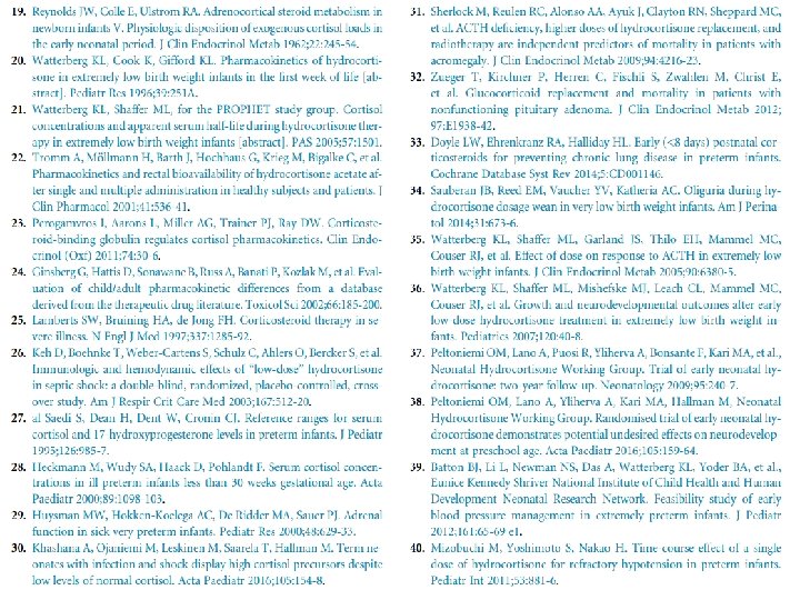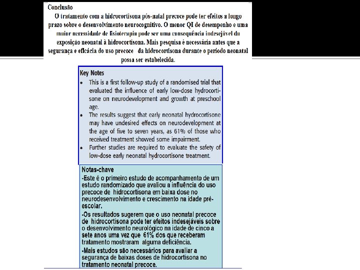Altas doses de hidrocortisona podem também ter efeitos adversos: 54 RN com muito baixo peso ao nascer tratadas para hipotensão ou dependência ventilatória. (34) Média da dose inicial de hidrocortisona de 2, 8 +/- 1 mg/kg/d; Alta incidência de oligúria (24%) => maiores doses e maior tempo de terapia sugerindo supressão adrenal; Baixa pressão arterial durante o desmame de hidrocortisona Em contraste: dose de 0, 5 mg/kg a cada 12 h por 12 dias seguida de 0, 5 mg/kg/d por 3 dias não suprimiu a função adrenal(35) ECR utilizando baixas doses de hidrocortisona (1 -2 mg/kg/d): 411 crianças: Não mostrou efeitos adversos no crescimento ou neurodesenvolvimento nas idades de 18 -22 meses. (36, 37) ECR em 35 crianças em idade escolar mostrou Correlação não-significativa entre tratamento precoce com hidrocortisona e deficiência neurocognitiva posterior; Enfatiza a necessidade continuada de acompanhamento a longo prazo. (38)