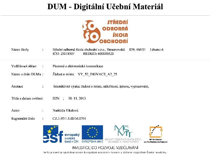 • Literatura: • [1] FLEISCHMANNOVÁ, E. ; JONÁŠ, I. ; KULDOVÁ, O. Písemná a elektronická komunikace pro střední školy a veřejnost 2. První vydání. Praha: Fortuna, 2005, 152 s. ISBN 80 -7168 -924 -6. • [2] SLAVÍČKOVÁ, M. ; VALEŠOVÁ, I. a kol. Obchodní dopisy nejen u státní zkoušky + sbírka úloh. 2. vydání. Praha: Národní ústav odborného vzdělávání – oddělení Státní těsnopisný ústav, 2008, 27 s. ISBN 80 -85118 -87 -4. • [3] ŠTIKOVÁ, S. Písemná a elektronická komunikace 2. Uzavírání a plnění kupních smluv. 8. vydání. Plzeň: KORESPONDENT, 2007, 119 s. • Název a číslo DUMU : • Anotace : Pik ; VY_52_INOVACE_A 2_25 Žádost o místo – ukázka