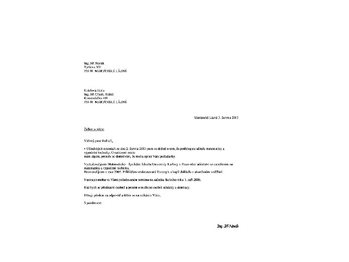 Ukázka žádosti Žádost o místo administrativního pracovníka oddělení ESC Vážení, na Vaší internetové stránce hledáte administrativního pracovníka. O nabízené místo mám velký zájem. Jsem absolvent obchodní akademie a v tomto oboru jsem již dříve pracoval několik měsíců. Mám roční praxi v Komerční bance a půl roční praxí v bance ČSOB. V minulém roce jsem úspěšně absolvoval státní zkoušku z administrativy a obchodní korespondence na OA Praha. Proto bych rád rozvíjel své znalosti v tomto oboru. Povolání administrativního pracovníka jsme vždy vykonával pečlivě a věřím, že s novými poznatky, jimiž mě obohatilo současné studium, budu platným členem Vašeho oddělení. S přátelským pozdravem Přílohy Životopis Kopie maturitního vysvědčení Kopie vysvědčení o státní administrativní zkoušce