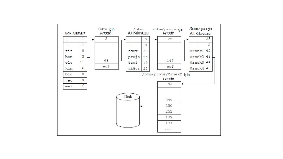 Dosya Yönetim Sisteminin Temel İşlevi • Mantıksal dosya yapılarından fiziksel yapılara geçişin sağlanması • İkincil belleklerin verimli kullanımlarının sağlanması • Dosyaların paylaşılması, korunması ve kurtarılması ile ilgili araçların sağlanması