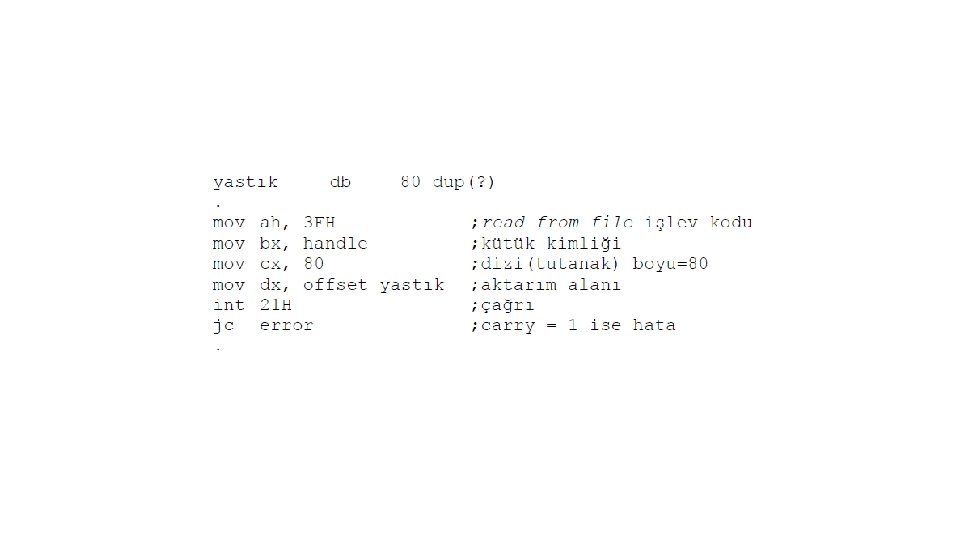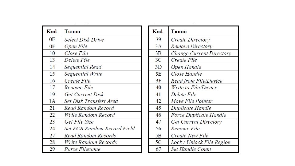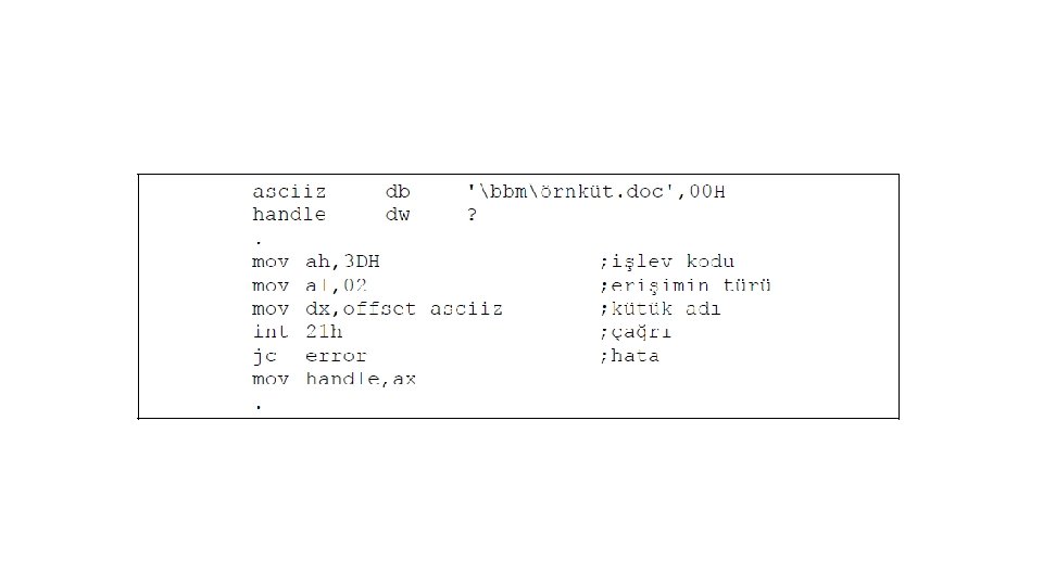 Dosya İşlemleri • Bir bütün olarak dosya – Oluşturma / Silme – Listeleme / yazdırma – Açma / Kapama – İsim değiştirme – Dosya işaretçisini konumlandırma – Özellik sorgulama/ değiştirme – Karşılaştırma – Yedekleme vb.