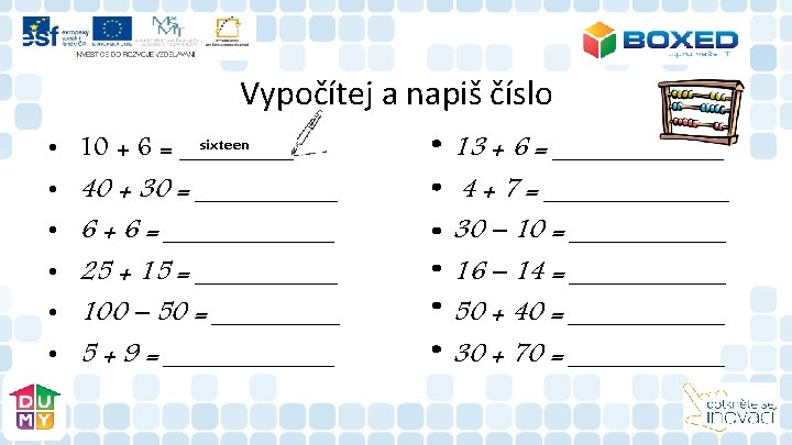 Metodický pokyn Ø Materiál je určen pro práci s interaktivní tabulí a tablety Ø Postup práce: Ø Na 1. str. žáci zaokrouhlují všechna čísla, která v písničce našli. A vypíší si je do sešitu, kdy k nim přiřadí správné číslo. Společně si poté zazpíváme písničku, kdy žáci ukazují jednotlivá čisla na prstech. Ø 2. str. – Spočítají počet a zapíší název číslovky – three, . . Ø 3. str. – Spojí číslo se správným názvem Ø 4. str. – přečtou správně příklad a zapíší výsledek – zapisují název číslovky – sixteen, … Ø 5. str. – postupně se objevují jednotlivá čísla – hromadně nebo jednotlivě čtou žáci čísla Ø Dále můžeme náhodně ukazovat čísla a žáci čtou jednotlivě/hromadně či zapisují do sešitu • Cíl: Upevnění a procvičení daného učiva