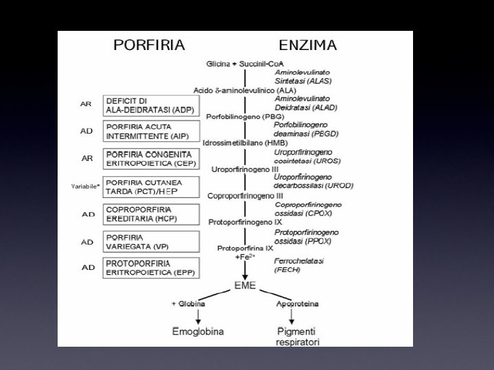 FALSO ADDOME ACUTO PORFIRIE CLASSIFICAZIONE ACUTE: Accumulo di metaboliti precoci non tetrapirrolici (ALA e PBG) con prevalenza di sintomi neurologici Porfiria acuta intermittente Coproporfiria ereditaria Porfiria variegata NON ACUTE: Accumulo di metaboliti tardivi tetrapirrolici (porfirine) con prevalenza di sintomi cutanei Porfiria eritropoietica congenita Porfiria cutanea tarda Porfiria epatoeritrocitaria