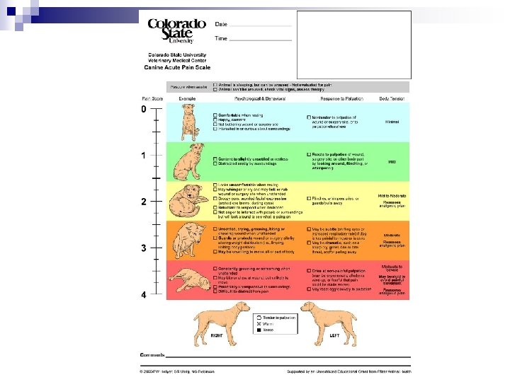 Douleur chez les mammifères n Chez l’animal, la douleur est très difficile à saisir, l’expression de douleur varie selon les espèces ¨ ¨ ¨ Changement de comportement Hypoactivité Absence de plaintes ou de signes parfois mort feinte pour éviter d’attirer des prédateurs ¨ ¨ Hyperactivité Vocalisation ¨ ¨ Grattage, léchage, mutilation de plaies Ronronnement chez le chat