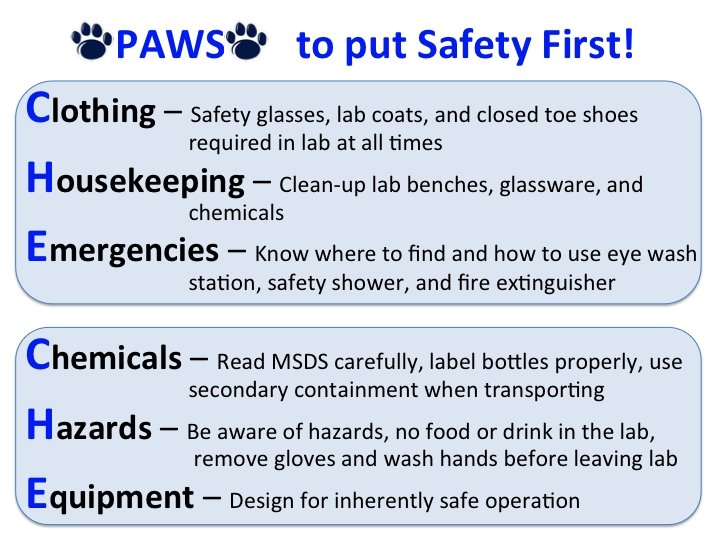 Ch. E Safety Initiatives • Expanded safety training program – Full day during initial orientation – Topics include chemical waste handling and disposal, chemical labeling, MSDS, hands-on fire extinguisher training, SOP, etc. – Required to obtain a key to lab • New incentives for safety performance – PAWS student of the month ($25 gift card) – Best research lab during EHS inspection