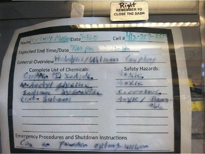 Chemistry Initiatives • Safety awareness incentive program – Recognition for completion of all EH&S requirements (decal posted on lab door) – Rewards for quarterly self-inspections and near-miss reporting (coffee and donuts provided at subsequent group meeting)