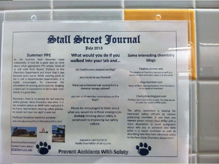 MATSE - Enhanced Communication Monthly Stall Wall and Newsletters Safety Moments before seminars Active engagement of staff and faculty with PSU EHS and Materials Research Institute