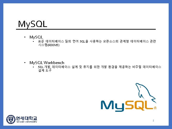 Download My SQL installer Download My SQL https Slides: 44 Download presentation Download My. SQL installer • Download My. SQL • https: //www. mysql. com/ 3 Download My. SQL installer • Download My. SQL • DOWNLOADS -> Community -> My. SQL on Windows 4 Download My. SQL installer • Download My. SQL • My. SQL on Windows -> My. SQL Installer 5 Download My. SQL installer • Download My. SQL • Click Download button 6 Download My. SQL installer • Download My. SQL • Click “No thanks, just start my download. ” • Download My. SQL installer 7 Download My. SQL installer • 하지만! 최신 버전의 문제로 인하여 5. 7. 17. 0 버전파일을 제공 • 다운로드 링크 : https: //drive. google. com/file/d/0 B 1 Wmg. J 4 bxjjedz. JXZWRZa. Uh. UY 1 U/view? usp=sharing 8 Install My. SQL 9 Install My. SQL 10 Install My. SQL 2. 11 Install My. SQL 12 Install My. SQL 13 Install My. SQL 2. 14 Install My. SQL 15 Install My. SQL 16 Install My. SQL 17 Install My. SQL 18 Install My. SQL 19 Install My. SQL 20 Install My. SQL 21 Install My. SQL 22 Install My. SQL 23 Install My. SQL 24 Install My. SQL 25 Install My. SQL 26 Install My. SQL 27 My. SQL-Workbench • Connect Database • Database -> Connect to database 28 My. SQL-Workbench • Connect Database • Set Stored Connection : Local instance My. SQL 29 My. SQL-Workbench 30 My. SQL-Make schema • Schema Tab -> Create Schema 31 My. SQL-Make schema Schema 이름 입력 32 My. SQL-Make table • Make Table • Open schema -> Tables -> Create Table 33 My. SQL-Make table • Make Table • Insert table information (Name, column type & name, key, etc. ) 34 My. SQL-Make table 35 My. SQL-Make table 36 Query test • File -> New Query Tab 39 Query test • File -> New Query Tab 40 Query test • Query 실행 문 작성 41