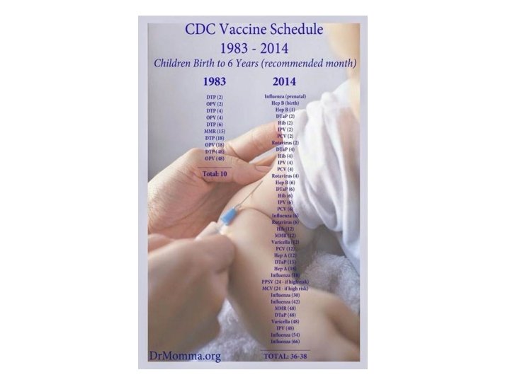 The Price of Prevention: Vaccine Costs Are Soaring* • The number of vaccine patent applications rose tenfold in the 1990 s to more than 10, 000 • New vaccines have entered the market at once. And this doesn’t figure in the price of autism, unthinkable prices ADHD, asthma, food allergies, etc. – Big pharmaceutical giants are making $$$$$ “We have to give it to every kid, so it’s a golden ticket, ” Dr. Lindsay Irvin, pediatrician (She remortgaged her home to afford their rising prices) – 33% of family doctors are considering giving up immunizations because of the expense – 40% do not offer all the required immunizations *Elisabeth Rosenthal, NY Times, JULY 2, 2014