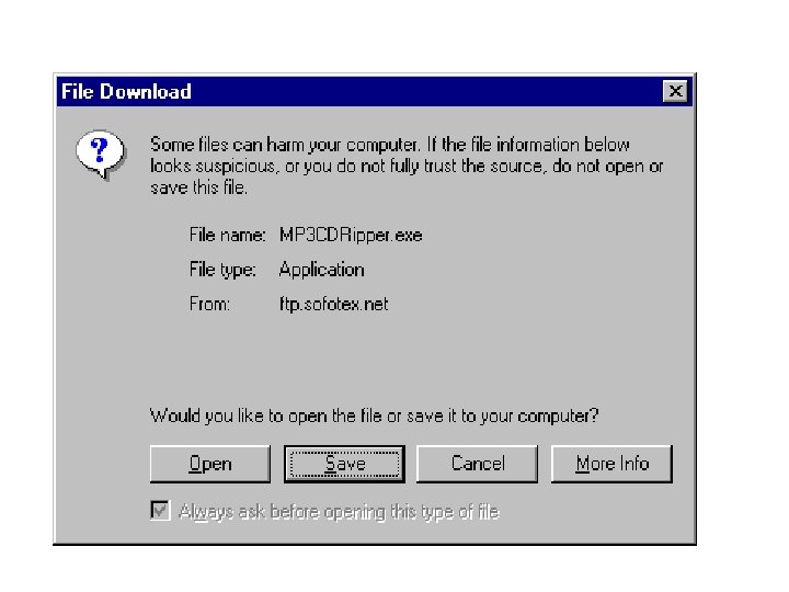 • Downloading defined: Downloading is the process of copying a file (such as a game or utility) from one computer to another across the internet. When you download a game from our web site, it means you are copying it from the author or publisher's web server to your own computer. This allows you to install and use the program on your own machine. • Here's how to download a file using Internet Explorer and Windows 98. If you're using a different browser such as Netscape Navigator or a different version of Windows, your screens may look a little different, but the same basic steps should work. • 1. Click on the download link for the program you want to download. • 2. You may be asked if you want to save the file or run it from its current location. If you are asked this question, select "Save. " If not, don't worry -- some browsers will automatically choose "Save" for you.