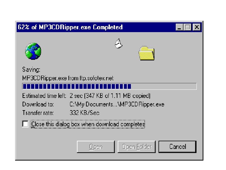 • 3. You will then be asked to select the folder where you want to save the program or file, using a standard "Save As" dialog box. Pay attention to which folder you select before clicking the "Save" button. It may help you to create a folder like "C: My DocumentsDownload" for all of your downloads, but you can use any folder you'd like. 4. The download will now begin. Your web browser will keep you updated on the progress of the download by showing a progress bar that fills up as you download. You will also be reminded where you're saving the file. The file will be saved as "C: My DocumentsDownload" in the picture below. • Note: You may also see a check box labeled "Close this dialog box when download completes. " If you see this check box, it helps to uncheck this box. You don't have to, but if you do, it will be easier to find the file after you download it.