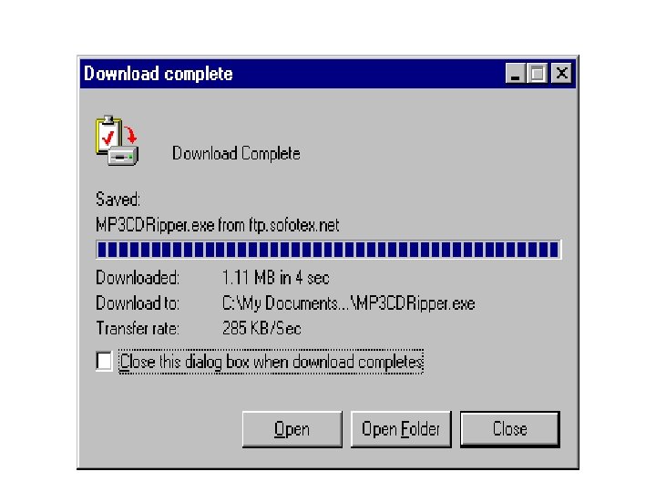 • 5. Depending on which file you're downloading and how fast your connection is, it may take anywhere from a few seconds to a few minutes to download. When your download is finished, if you left the "Close this dialog box when download completes" option unchecked, you'll see a dialog box like this one: