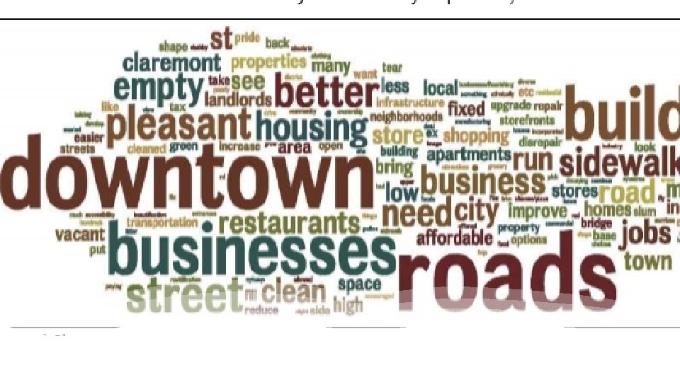 According to public input to the question of "What areas of town need improvement? ": “The City Center received the most attention. The need to maintain appearances (e. g. collecting trash, maintaining sidewalks, maintaining buildings) and proper stewardship of the buildings (e. g. property maintenance, enforcement o City codes, reduce absentee landlords) were popular responses. Comments included interest in City support for private investment, small businesses, restaurants, and neighborhood revitalization…. . and pedestrian facilities” Public participants focused on: “ Enhancing the City Center as a commercial center with a strong creative economy ranging from technical enterprises like the Maker Space to cultural and arts-related enterprises and activities. Community aesthetics for City Center, gateways to the City (for visitors), and neighborhood streets. Transportation facility improvements ranged from a truck route bypass around the City, sidewalks along Charlestown Road, and enhancing existing transit service and providing shuttles between the City Center and the hospital, community college, and Washington Street. “