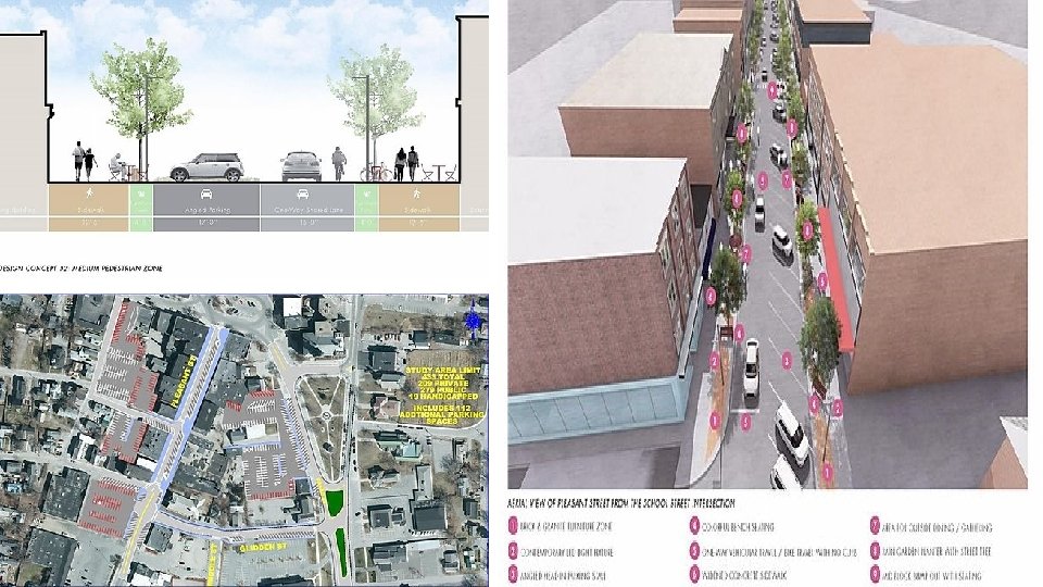 Pleasant St Revitalized The new downtown plan fixes several issues -Adds to parking spaces that would be needed if all buildings were fully utilized -Adds parking in the areas that can benefit from more parking -It adds to the ease of pedestrian access, lighting, smooth sidewalks, wider sidewalks, less traffic to cross, etc. -It integrates parking lots into the downtown area with better signage and connected lots -It decreases truck traffic -It decreases wear and tear on our business district streets -It decreases impact on our historical buildings downtown -It puts to use underutilized spaces -It integrates shared parking -It increases property values downtown