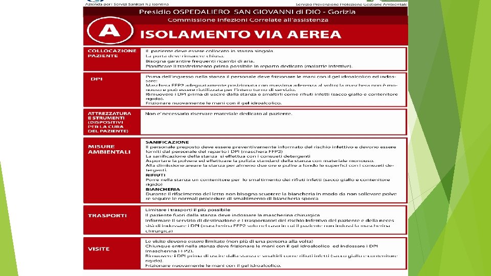 TRASMISSIONE SARS-COV 2 Droplets: quando le persone entrano in stretto contatto (a meno di 1 metro di distanza) o in contatto diretto con una persona infetta. Le vie di infezione più frequenti sono occhi, naso e bocca. Aerosol: può avvenire in ambienti specifici, in particolare spazi interni, affollati e non adeguatamente ventilati dove le persone infette trascorrono lunghi periodi di tempo con altri. Contatto: può diffondersi dopo che persone infette starnutiscono, tossiscono e toccano superfici o oggetti come tavoli, maniglie, corrimano e ci si tocca occhi, naso e bocca senza aver prima lavato le mani.