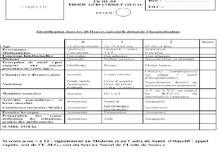 UMG Clermont-Fd : Enquête « SEGA » 2006 -2007 ● 4 services de court séjour volontaires pour la tester : - 2 services de médecine : néphrologie et endocrinologie - 2 services de chirurgie : digestive et orthopédique ● Personnel soignant grille SEGA dans les 48 premières heures après l’admission du patient ● UMG « alertée » par fax (ou téléphone) lorsque score SEGA 12 (seuil que nous avons défini… 4 groupes dans l’article original)