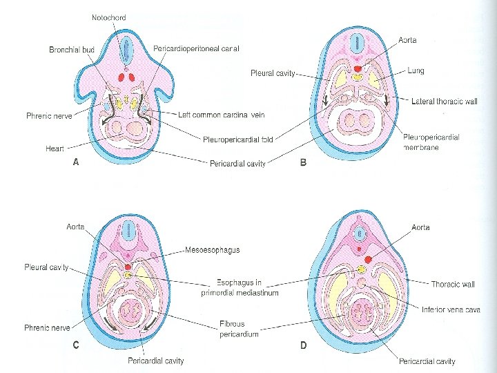 PLEUROPERICARDIAL MEMBRANES • THE PARTS SURROUNDING THE SEROUS PERICARDIUM: form the fibrous pericardium • THE PARTS BEHIND THE HEART: fuse with the ventral mesentery of the esophagus (at 7 th week), forming the mediastinum & separating pericardial from pleural cavities • N. B. : The right pleural cavity separates from pericardial cavity earlier than left