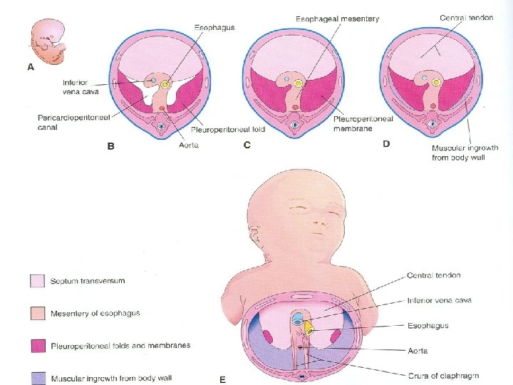 DEVELOPMENT OF DIAPHRAGM • The diaphragm develops from: 1. Septum transversum: forms the central tendon 2. Dorsal mesentery of esophagus: forms the right & left crus 3. Muscular ingrowth from lateral body wall: posterolateral part (costal part) 4. Pleuroperitoneal membranes: small portion of diaphragm