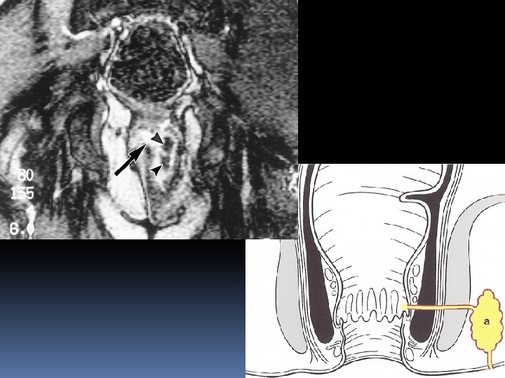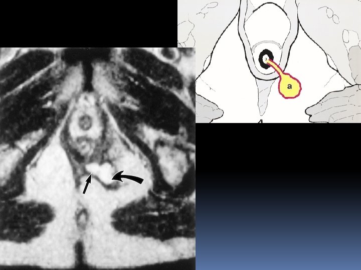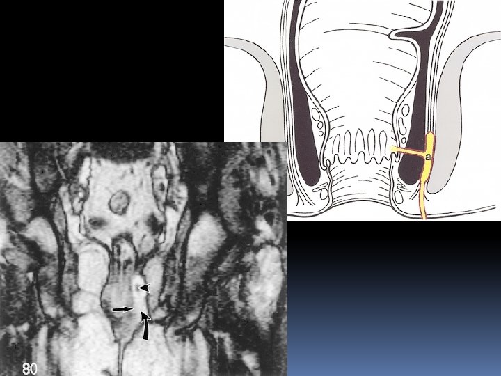 Suprasphincteric fistula Two tracts in ischeorectal region The right sided tract runs over the puborectal muscle (asterisc) & the mucosal opening lies at the level of dentate line (black arrow)