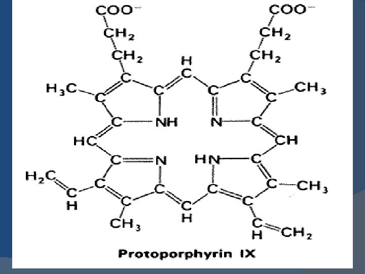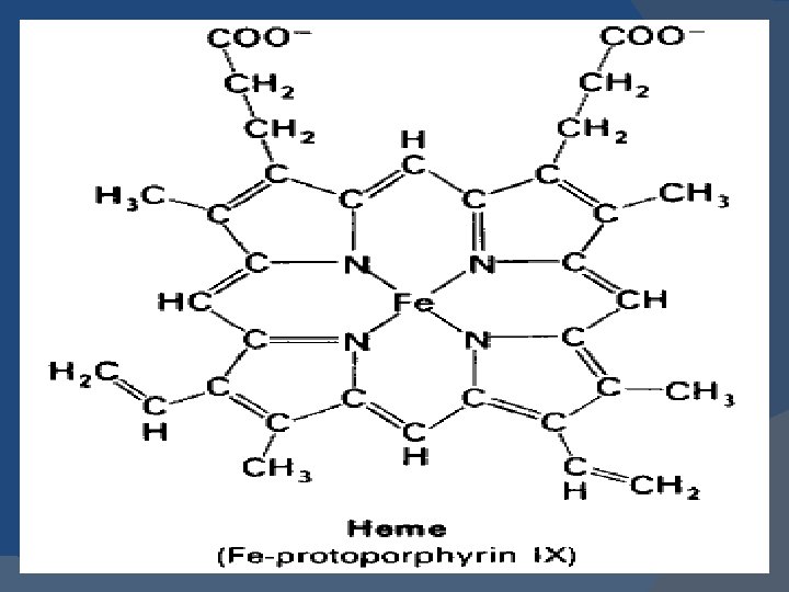 Structure and bonding � A Heme group is a flat ring molecule containing carbon, nitrogen and hydrogen atoms, with a single Fe 2+ ion at the center. � Without the iron, the ring is called a Porphyrin. � In a heme molecule, the iron is held within the flat plane by four nitrogen ligands from the porphyrin ring.
