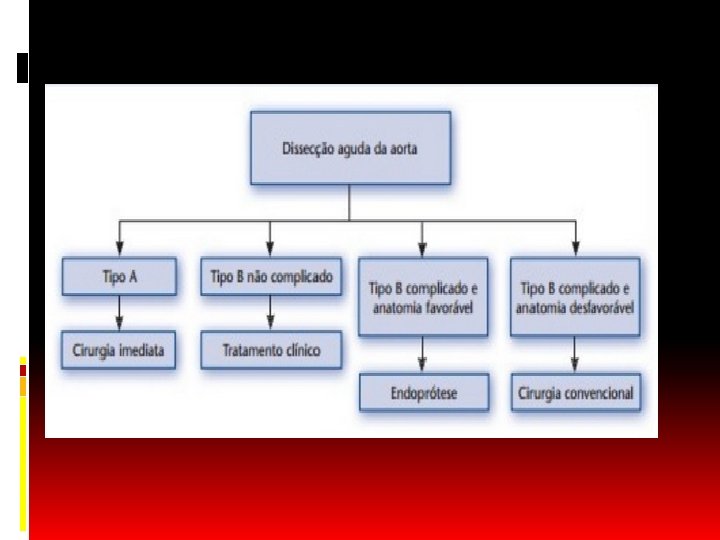 Presença de complicações Isquemia: - >1/3 dos pcts, sendo mais comum a isquemia de algum ramo aórtico abdominal em 27% das dissecções. - 2 mecanismos principais: estático (flap intimal entra na origem de um ramo) e dinâmico (flap intimal poupa o ramo, mas prolapsa e oblitera sua origem). - Esses 2 mecanismos tem tratamentos distintos: O estático através da colocação de stent. - O dinâmico através de fenestrações do flap intimal para reduzir a pressão da falsa luz.