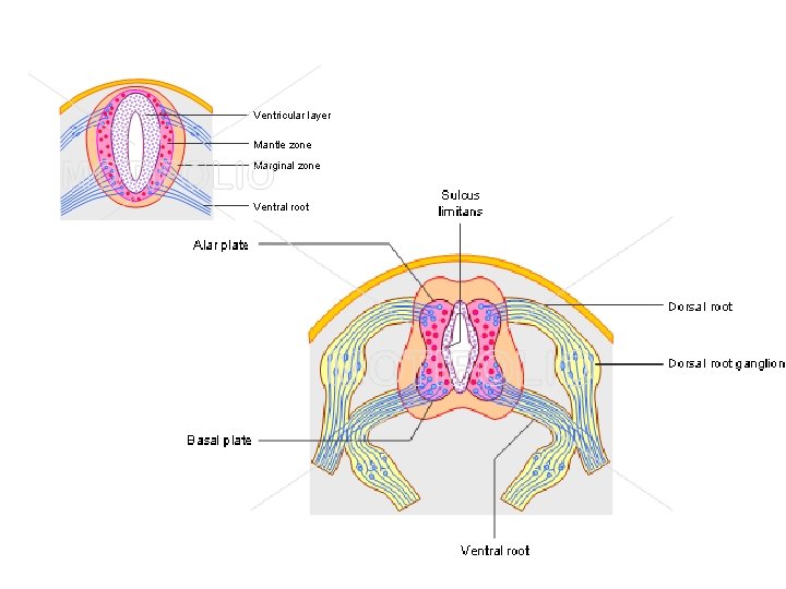 Spinal Cord Development Afferent sensory Sulcus neuroblasts limitans Roof Plate Marginal Zone Afferent sensory Dorsal column Lateral column neuroblasts in spinal ganglion Dorsal root of spinal nerve Efferent motor neuroblasts Floor Plate Ventral column Ventral root of spinal nerve