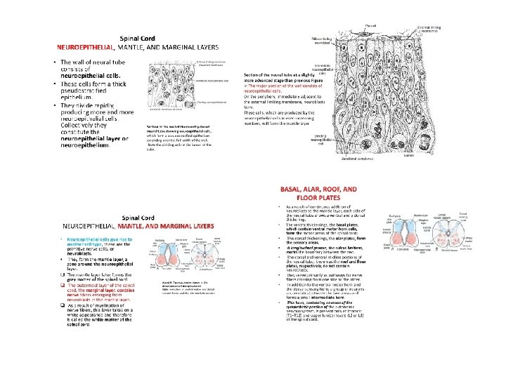 EMBRYOLOGY SUMMARY The spinal cord develops from the NEURAL PLATE from above the notocord. With the folding of the NEURAL TUBE the central canal is formed (lining: ependyme). Neuroepithelial cells will give rise to neurons and glia. (Head mesenchyme) the DRG and the sympathetic neurones derive from the neural crest. The proneurones form a mantle zone (grey matter) with the axons growing towards the surface and so is the marginal zone formed (turns later into white matter). The notochord secrets a factor known as Sonic hedgehog or SHH. As a result, the floor plate then also begins to secrete SHH, and this will induce the basal plate to develop motoneurons. Meanwhile, the overlying ectoderm secretes bone morphogenetic protein (BMP). This induces the roof plate to begin to secrete BMP, which will induce the alar plate to develop sensory neurons. The alar plate and the basal plate are separated by the sulcus limitans. Additionally, the floor plate also secretes netrins. The netrins act as chemoattractants to decussation of pain and temperature sensory neurons in the alar plate across the anterior white commissure, where they then ascend towards the thalamus. The marginal zone develops into a massive passage of axans divided into 3 funiculi by the grey matter, posterior, lateral and anterior.