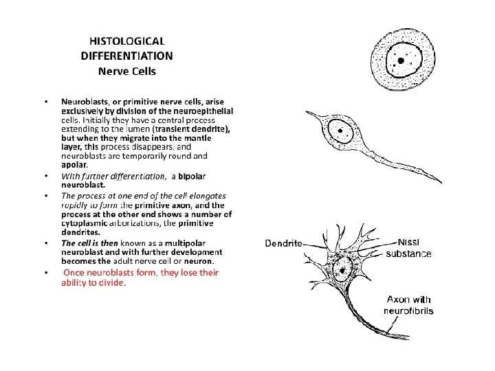 Development of Spinal Cord Neurogenesis Neuroblasts have a central process extending to the lumen (transient dendrite), but when they migrate into the mantle layer, this process disappears, and neuroblasts are temporarily round apolar. With further differentiation, two new cytoplasmic processes appear on opposite sides of the cell body, forming a bipolar neuroblast (primitive axon, primitive dendrites) The cell is then a multipolar neuroblast and with further development becomes a neuron Neuroepithelial cells Bipolar neuroblast Multipolar neuroblast